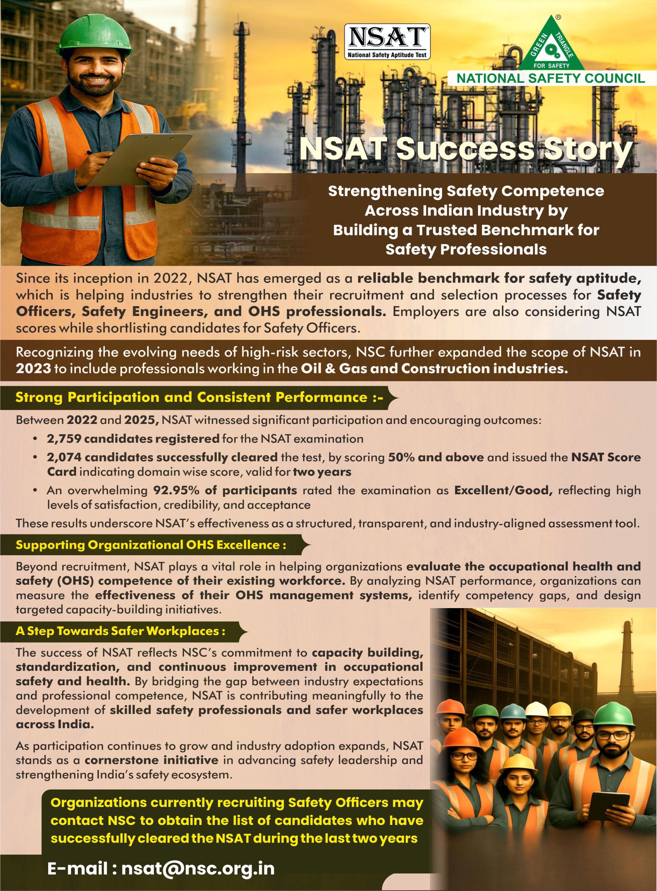 To meet the growing demand for competent safety professionals, the National Safety Council (NSC) initiated the National Safety Aptitude Test (NSAT) in 2022. The examination assists industries in screening and identifying capable safety officers, engineers, and safety professionals.